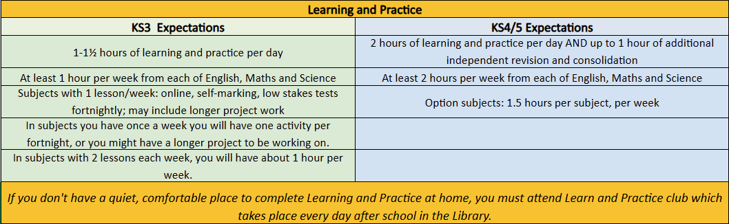 We talk about ‘learning and practice’ (instead of ‘homework’) to help students to understand the purpose of these tasks, to clarify to families what the expectation is, and to refocus these activities on acquiring knowledge (‘learning’) and developing skills (‘practice’). Learning key words and new vocabulary and practising skills and techniques needed for exam success are shown to be effective in boosting students’ progress and achievement. We will also be teaching specific revision techniques in lessons and encouraging staff to refer to a named technique when asking students to revise at home. (See the linked page on Revision Strategies at STA.)