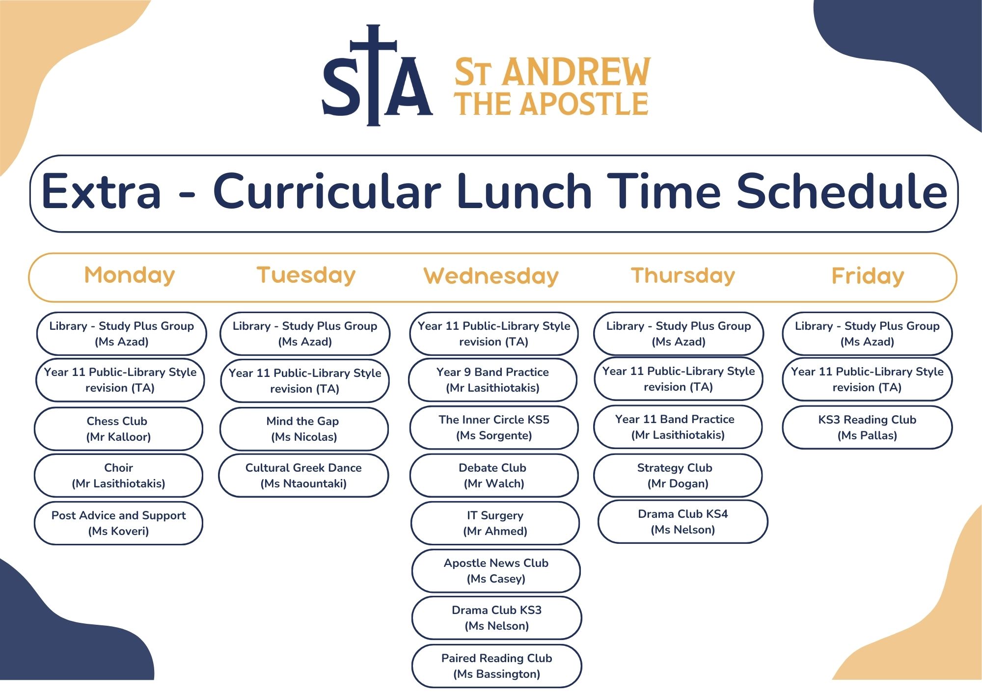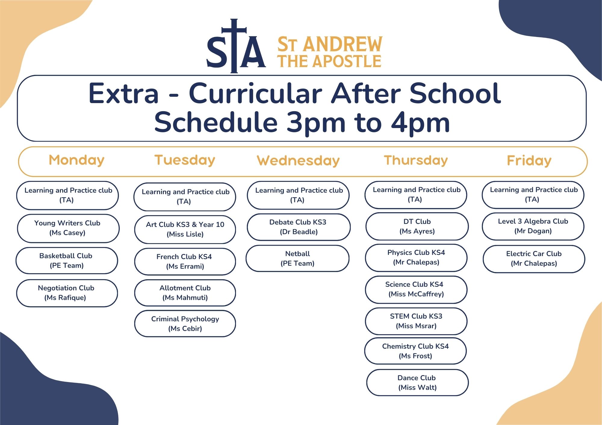 Staff members will offer clubs and activities linked to their interests as well as their subject areas. Some clubs will be overseen by staff but will be led by students who have particular expertise and interests. Please see below for updated clubs and activities: