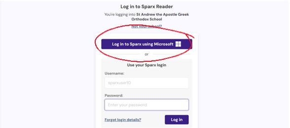 If students are already logged into their school Microsoft 365 account (as described above), the easiest way to log into Sparx Reader is simply to click the "Microsoft 365" button, ringed in red in the screenshot below.